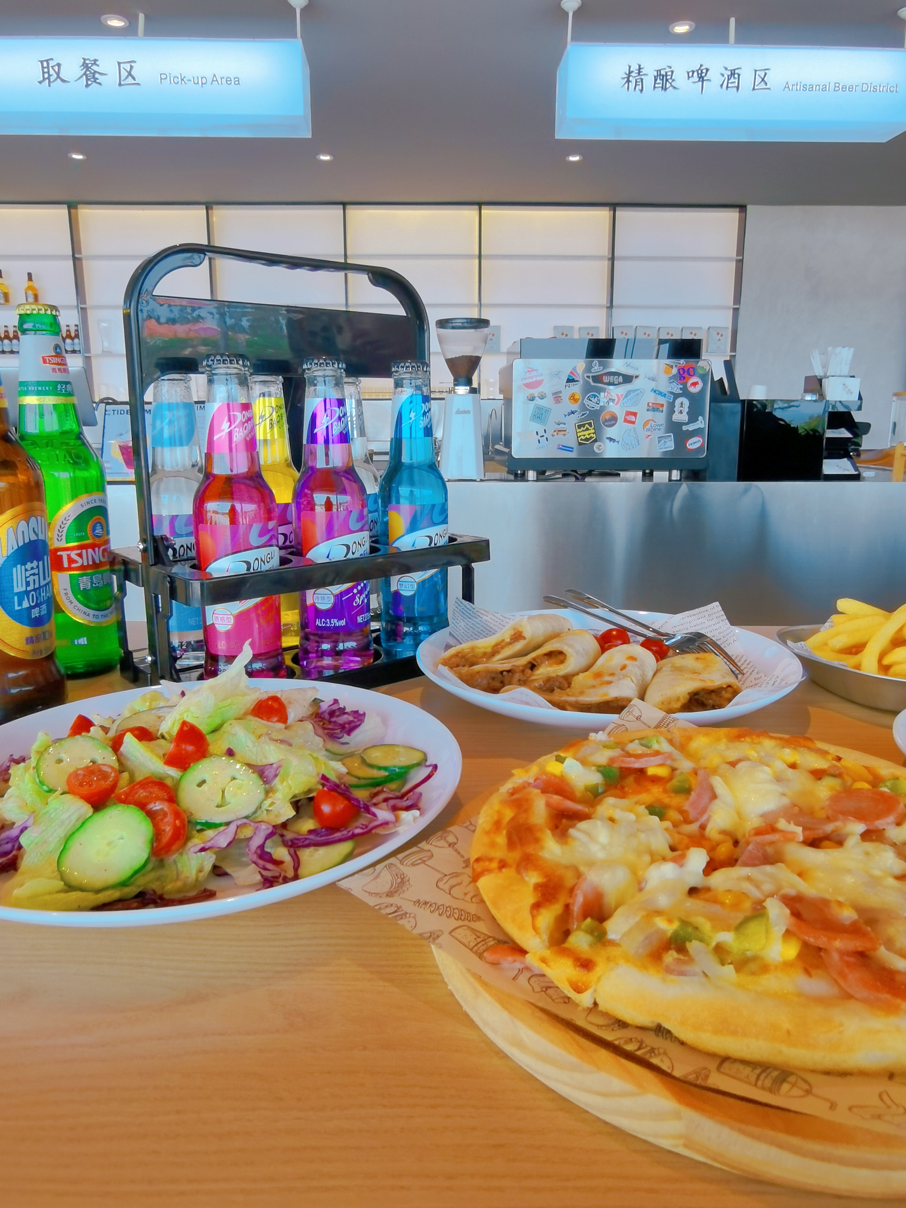 吃貨雷達(dá)啟動(dòng):現(xiàn)烤披薩,搭配酥脆薯?xiàng)l炸雞,碳水控直接跪服;嶗山電烤肉,本地人私藏風(fēng)味,一口穿越老青島;美式牛肉餅,爆汁厚切肉餅+會(huì)拉絲的芝士瀑布;微醺研究所,精釀啤酒/調(diào)酒/小眾葡萄酒,配山海夜色絕了;日間提供精品手沖咖啡、特調(diào)冷萃。