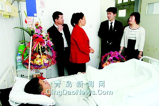 | 華世通集團(tuán)有限公司、圣豪汽車銷售服務(wù)有限公司、東風(fēng)日產(chǎn)海友專營店的員工到青醫(yī)看望呂曉彬。臧磊攝 |