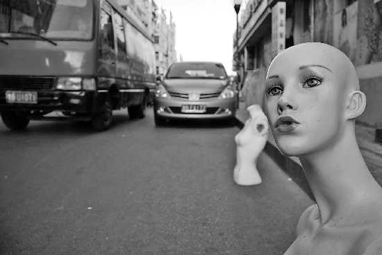 為防止私家車隨意停放,在大成路上,一服裝店老板把店內(nèi)的兩個(gè)個(gè)模特架子搬到自己店鋪門前搶占車位(張曉鵬 攝)