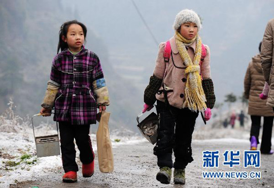 1月6日,湖南新晃縣茶坪鄉(xiāng)的孩子們手提簡易火爐走在冰凍的山路上。龍弘濤 攝