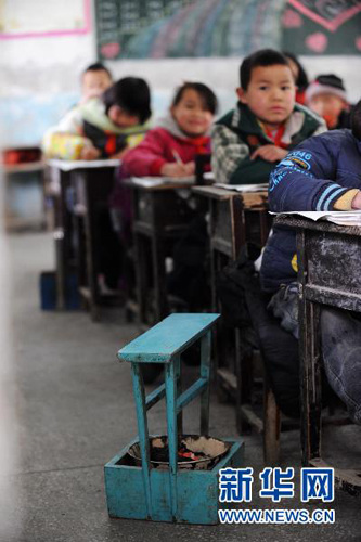 1月6日,湖南新晃縣茶坪學(xué)校的孩子們將火爐置于座位下讀書。龍弘濤攝