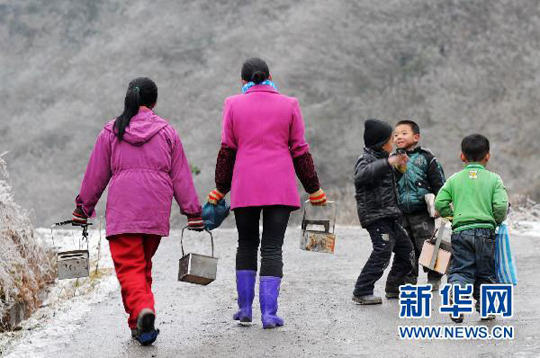 1月6日,湖南新晃縣茶坪鄉(xiāng)放學(xué)回家的小學(xué)生和他們的家長手提簡易火爐走在冰凍的山路上。龍弘濤 攝