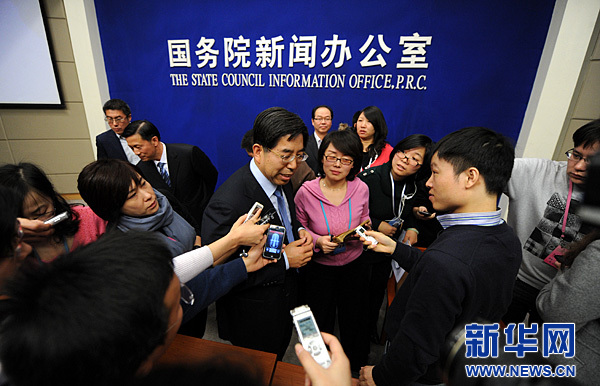 發(fā)布會結(jié)束后記者爭相采訪馬建堂。新華網(wǎng) 陳競超 攝