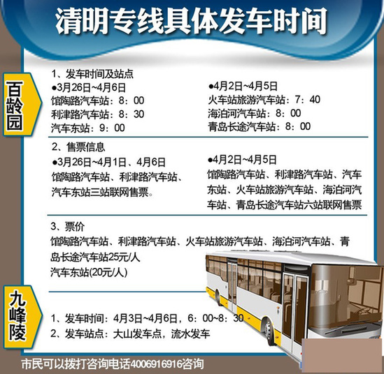 ????清明節(jié)即將到來,3月23日,記者從青島交運集團了解到,為方便市民掃墓,從3月26日開始一直到4月6日,交運集團將安排車輛到百齡園和九峰陵兩地。(記者 昌旭光)