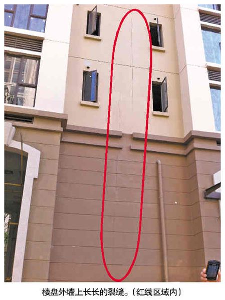????12月18日,一位購(gòu)買了一期2棟房子的業(yè)主偶然間爬上了樓頂,發(fā)現(xiàn)樓頂出現(xiàn)大面積的水泥開(kāi)裂,接下來(lái)業(yè)主們發(fā)現(xiàn)一期3棟、二期6棟也出現(xiàn)了同樣的問(wèn)題。記者在一期3棟外面看到,外墻的中間出現(xiàn)一條長(zhǎng)長(zhǎng)的裂縫,一直從15層樓頂貫穿至地面。