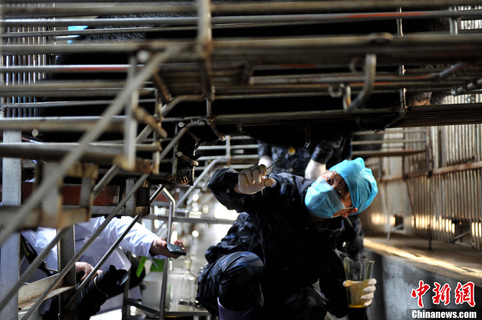2月22日,歸真堂“黑熊養(yǎng)殖基地”對外開放,這個備受關(guān)注的“開放日”吸引了來自海內(nèi)外百余名媒體記者。圖為“活熊取膽”過程。王東明攝