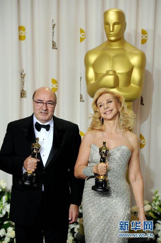 2月26日,在美國洛杉磯好萊塢,因影片《鐵娘子》獲第84屆奧斯卡最佳化妝獎的馬克·庫利耶和J·羅伊·赫蘭手捧“小金人”留影。第84屆奧斯卡頒獎典禮當(dāng)天在此舉行。(新華社記者楊磊攝)
