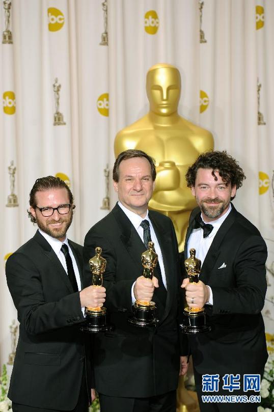 2月26日,在美國洛杉磯好萊塢,因影片《雨果·卡布里特》獲第84屆奧斯卡最佳視覺效果獎的羅布·萊加托、本·格羅斯曼和亞歷克斯·亨寧(左至右)手捧“小金人”留影。第84屆奧斯卡頒獎典禮當天在此舉行。
