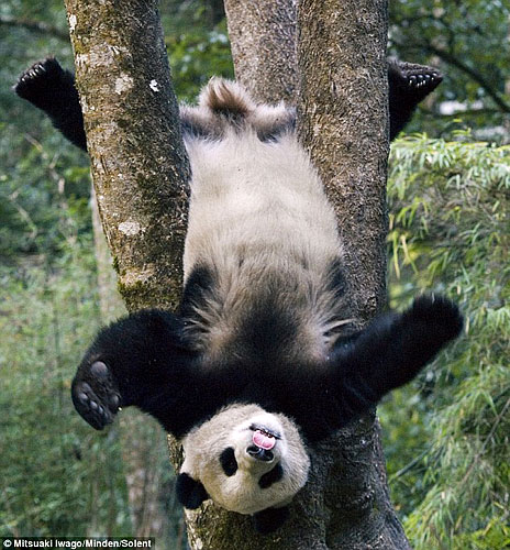 四川臥龍國(guó)家級(jí)自然保護(hù)區(qū)中,一只大熊貓幼崽正掛在一棵樹(shù)上為觀眾表演它的倒立“功夫”。日本攝影師Mitsuaki Iwago抓拍到這組妙趣橫生的,表現(xiàn)大熊貓異常運(yùn)動(dòng)能力的照片。(張健偉)