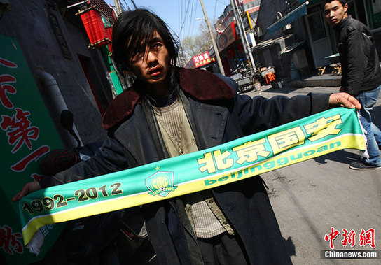 近日,一位在西單圖書大廈周圍靠撿瓶子為生的“犀利哥”走紅網(wǎng)絡(luò)?!跋纭敝苄裾f他是北京人,從小就喜歡看球,喜歡國安隊(duì),可父母不同意,因此,16歲時他就離家出走,從此周旭開始獨(dú)自生活。因?yàn)橐簧礤邋莸囊路?,靠撿瓶子買年票觀看國安比賽,29歲的周旭人稱“國安犀利哥”。為買國安年票要撿4000個瓶子,這需要周旭兩個月的時間。圖為3月27日,“犀利哥”展示買國安年票時得到的贈品——國安圍巾。