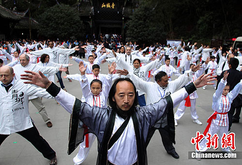 4月3日,包括15名駐華大使在內(nèi)的32個(gè)國家的駐華使節(jié)來到四川青城山,在青城派掌門、青城太極大師劉綏濱的示范指導(dǎo)下練習(xí)青城太極。中新社發(fā)蘇丹 攝