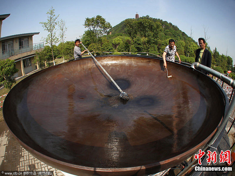 ???? 4月28日,江蘇南通狼山風景區(qū)園博園,工作人員當天為直徑3.5米的碳素鋼材質(zhì)“世界第一鍋”進行了放水、點火和上油,做好了利用“天下第一鍋”煮江鮮的準備。