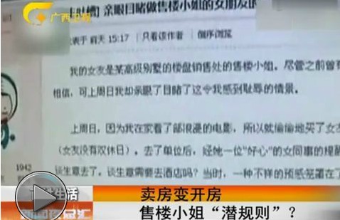 ????關鍵詞: 潛規(guī)則,售樓小姐,賣房子 ????小范(業(yè)內人士):因為做銷售這一行業(yè)的,不管是賣房、賣車啊,還是賣其它任何的東西,可能都會遇到這種事情。小范(業(yè)內人士):其實我覺得這個東西跟這個行業(yè)沒有關系,跟這個人有關系,想要做得長久的話,大家都不會選擇飲鴆止渴的方式。 ????廣西衛(wèi)視4月30日節(jié)目播出“賣房變開房售樓小姐潛規(guī)則”,以下為文字實錄: ????主持人:再來看下面一個消息,據說各行各業(yè)都有“潛規(guī)則”,對于賣房子的售樓小姐,這一類的潛規(guī)則的傳說那也是不斷,最近有人在網上就發(fā)貼說,他的女朋友是售樓小姐也“潛規(guī)則”。 解說:這位小伙子說自己的女朋友是某高級別墅的售樓小姐,上周日他去接女朋友下班的時候,竟然被自己的同事告知,女朋友和客戶去某星級酒店談生意了,將信將疑的他隨后竟然在酒店的房間里看見了衣衫不整的女朋,而女朋友解釋說這都是為了提高業(yè)績和收入,小伙子非常氣憤,那這樣的“潛規(guī)則”再房產銷售這個行業(yè)里真的存在嗎? 有業(yè)內人士說,這樣的情況只是一些極個別的現象,絕大多數存在于一些高檔樓盤的銷售中,因為每賣掉一套房都會給他們帶來一筆不菲的收入,而不少房產公司對銷售人員也有考核,一定時間內不達標的話就會被掃地出門,在生活壓力下,有些售樓小姐會選擇犧牲色相。 小張(業(yè)內人士):因為做賣房子的確實是一個吃青春飯的行業(yè),也有很多的小姑娘就是賣著賣著,就成為了那個房子的主人,這種情況也有很多。 解說:對于售樓的“潛規(guī)則”業(yè)內人士小范說,她也是有所耳聞的。 小范(業(yè)內人士):因為做銷售這一行業(yè)的,不管是賣房、賣車啊,還是賣其它任何的東西,可能都會遇到這種事情。 解說:小范說有極少一部分客戶會想辦法約你出去吃飯或者玩,期間會提出一些非分的要求。 小范(業(yè)內人士):其實我覺得這個東西跟這個行業(yè)沒有關系,跟這個人有關系,想要做得長久的話,大家都不會選擇飲鴆止渴的方式。 主持人:這位范小姐說的話我覺得相當的有道理,這個潛不“潛規(guī)則”我覺得要看個人,不是看行業(yè),愛動歪腦筋的客戶我相信哪個行業(yè)都有,就看您自個能不能夠守住原則了。 |