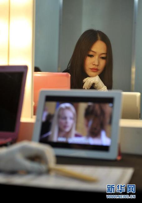 4月29日,劉靜文在走秀間隙看外國專業(yè)模特走秀視頻。