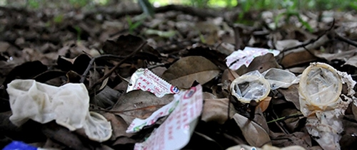 貢院井石碑的后面是一片小樹林和草叢,鉆進(jìn)小樹林沿著小路前行,快走到盡頭時(shí),一塊被人為踩出來的空地出現(xiàn)在記者眼前,雖然地面上落滿了厚厚的落葉,但仔細(xì)一看,記者驚訝萬分:使用過的避孕套和包裝散落一地,衛(wèi)生紙也隨處可見,其惡心程度不言而喻。