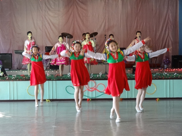 旅行團(tuán)參觀平壤一所示范小學(xué)時(shí),學(xué)生們?yōu)橛慰捅硌莞栉琛?/p>