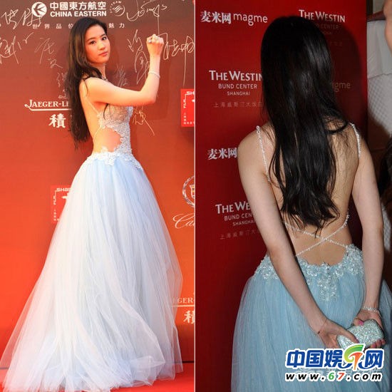 劉亦菲淺藍(lán)水晶蕾絲紗難掩清純氣息,露背裝性感大突破不失玉女風(fēng)范。