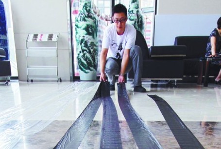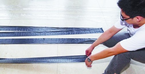 ????記者首先在無風(fēng)、空曠的地面上,用卷尺測量并標(biāo)注出9米長度,隨后分段對3個樣本逐一測量。由于保鮮膜有強延展性,記者在測量過程中,盡可能把3卷保鮮膜都均勻、自然地平行鋪在地面上,使其自然延伸,再逐一測量。