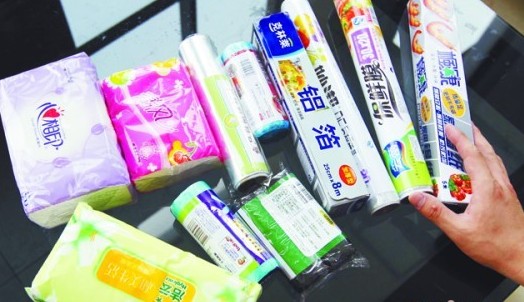 ????7月6日,記者在寧夏路大潤發(fā)超市內(nèi),購買了保鮮膜、垃圾袋、錫紙、抽紙這4類產(chǎn)品。為了最大限度地保證隨機性,保鮮膜、垃圾袋、抽紙這3類產(chǎn)品,每類都購買了3樣,價格、品牌每樣都不同;錫紙由于可選種類很少,記者則購買了不同品牌、不同價格但用途一樣的錫紙和鋁箔紙各一卷。