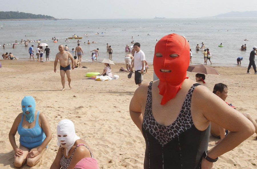 7月6日,山東青島第一海水浴場,女士們戴著尼龍面罩在海水浴場游泳。
