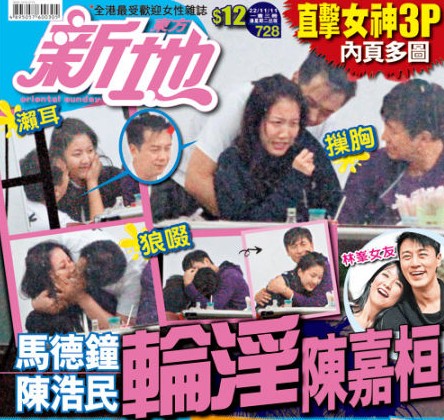 陳浩民狼吻陳嘉桓:11月,香港某周刊刊登的幾張偷拍照片引起網(wǎng)友圍觀。照片中,一位疑似陳浩民的白衣男子對女星陳嘉桓又摟又抱,令女方十分尷尬;另一位疑似馬德鐘的男子也對陳嘉桓有比較親昵的舉動。幾張照片讓馬德鐘與陳浩民酒后無德的傳言在網(wǎng)絡中蔓延。該周刊描述,喝了不少酒的馬德鐘與陳浩民越玩越瘋,對陳嘉桓的舉動也越發(fā)開放,甚至做出讓女方不悅的親昵舉動。之后他第一時間攜待產的妻子召開道歉會,聲淚俱下,引起“作秀”一說。