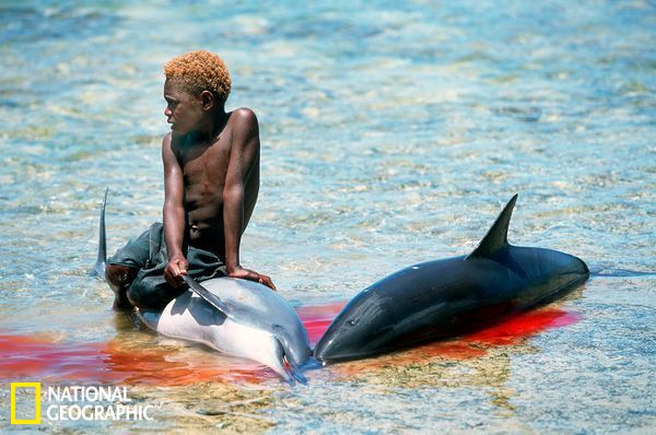 巴布亞新幾內(nèi)亞一名男孩正坐在一頭被捕殺的海豚身上,觀看其他村民繼續(xù)他們的傳統(tǒng)捕獵行為。一直以來(lái),海洋生物都被認(rèn)為是一種必要的營(yíng)養(yǎng)來(lái)源,像這種捕獵方式自古就有。島上一代代居民仍然繼續(xù)練習(xí)這種技能,他們要學(xué)會(huì)理解海豚的行為。他們可以利用木槳、竹竿和巨石來(lái)干擾海豚之間的交流,從而實(shí)現(xiàn)獵殺的目的。