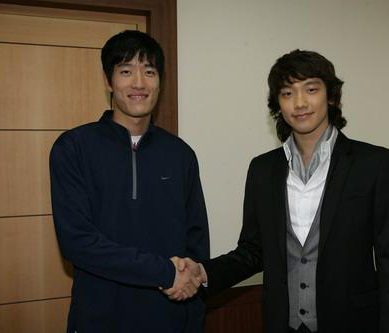 韓國人氣小天王Rain作為大邱田徑世錦賽的宣傳大使 與劉翔一同出席比賽宣傳活動(dòng)