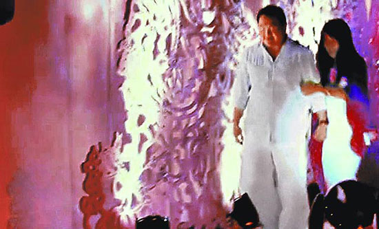一身白的劉德祖(左)與素顏的ELVA離開沙灘的華麗舞臺