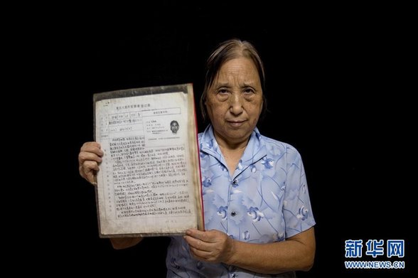 2012年9月12日,重慶,76歲的王邦俐老人,拿出受害者登記錄,高喊還我公道。王邦俐,女,生于:1938年8月8。出生地:九龍坡區(qū),籍貫:重慶市,受難日期:1939年6月。家及“同心電料行”的商店炸毀,母親在躲避轟炸的途中眼睛受了傷,臉也腫了,雖然經(jīng)過簡單的治療,但視力越來越差,由于無錢繼續(xù)治療,左眼就失明了,右眼也只有微弱的光感。