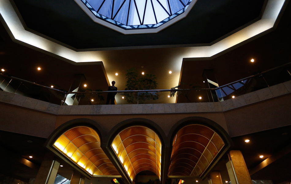 2012年9月18日,平壤,一個(gè)男子站在一個(gè)飯店的樓梯上。Vincent Yu/攝