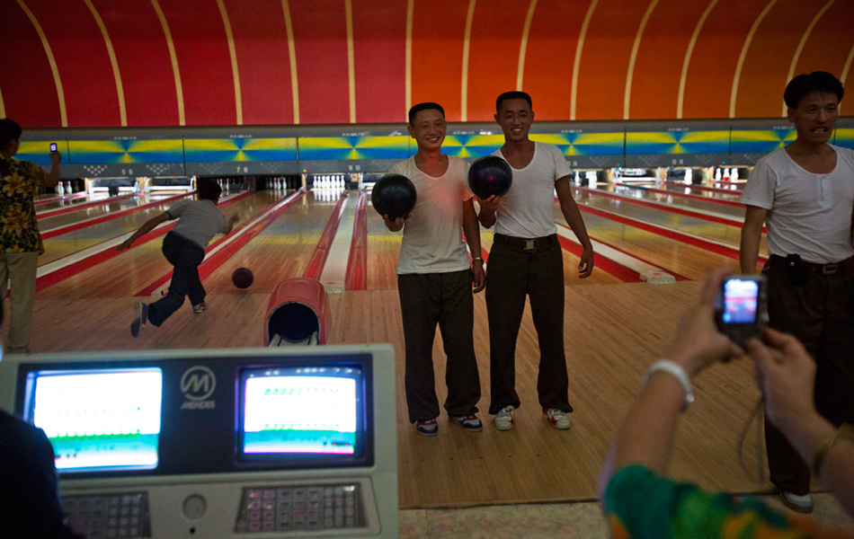 2012年9月7日,朝鮮首都平壤,兩名男子在保齡球館中合影留念。 David Guttenfelder/攝