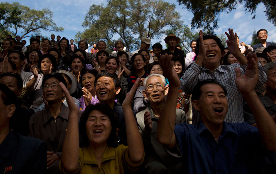 2012年9月14日,平壤,年度錦標(biāo)賽開(kāi)幕式上,觀(guān)眾觀(guān)看傳統(tǒng)的摔跤比賽。David Guttenfelder/攝