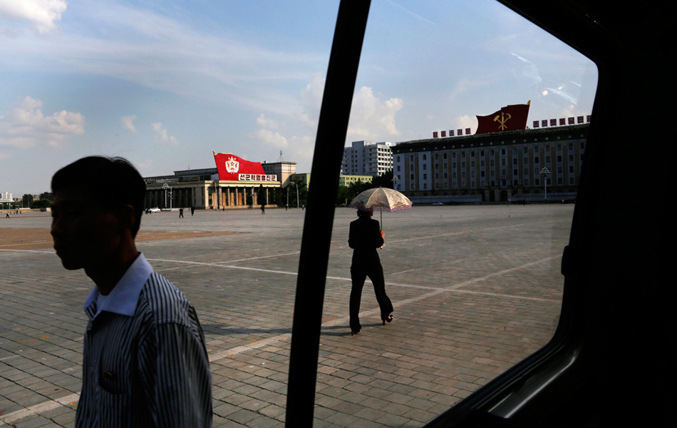 2012年9月20日,朝鮮平壤,行人走過金日成廣場。Vincent Yu/攝