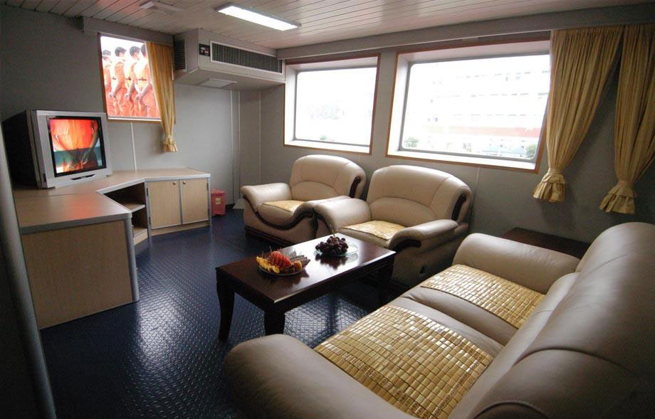 2006年5月23日,執(zhí)行海峽兩岸雙向遣返任務(wù)的新“海峽號”穿浪雙體工作船正式編列啟用。貴賓休息室。