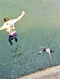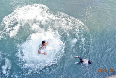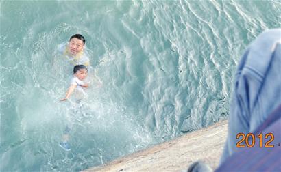 由于此處海水較深,男孩父親跳入海中后激起巨大的浪花,稍作停頓,男孩父親便撲騰著游向兒子。“男孩父親落水一折騰,男孩沉得更深了。”田波說,男孩父親費了好大力氣,終于靠近兒子,掙扎著將兒子托出水面,此時小男孩已喝了不少水,眼睛發(fā)直,嚇得哇哇大哭!