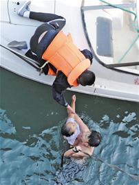 距離越來越近,趙師傅不斷收繩,將男孩父親慢慢拉向游艇,當(dāng)接近男孩父親后,趙師傅讓男孩父親松開救人小伙的手,他站在船尾將男孩父親往游艇上拉。此時,駕駛游艇的王建新也趕緊固定好游艇,拉著一根繩索去營救救人小伙和小男孩。