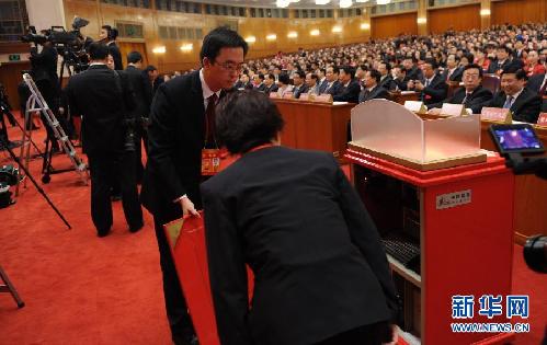 11月14日,中國共產(chǎn)黨第十八次全國代表大會(huì)閉幕會(huì)在北京人民大會(huì)堂舉行。 這是監(jiān)票人和工作人員在檢查票箱。新華社記者李學(xué)仁攝