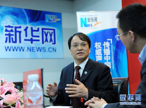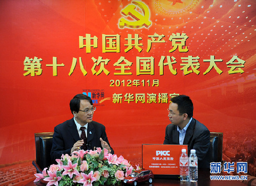 11月12日,十八大代表、江蘇省啟東中學(xué)校長王生做客新華網(wǎng)設(shè)在京西賓館的十八大訪談間,與網(wǎng)友在線交流。新華網(wǎng) 陳競超 攝