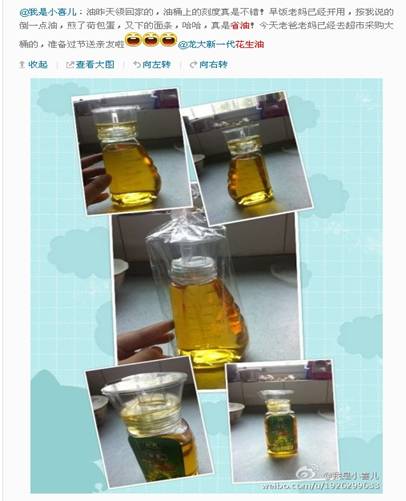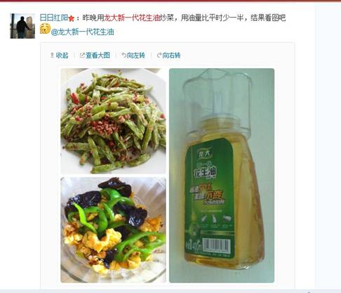 龍大食用油自上市以來(lái),不僅得到了中國(guó)糧油學(xué)會(huì)和有關(guān)專家的認(rèn)可和贊許,消費(fèi)者的好評(píng)也接連不斷。在新浪微博上,很多消費(fèi)者曬出了用龍大食用油做出各種美食的照片,同網(wǎng)友分享,這些自發(fā)的行為都驗(yàn)證了龍大食用油健康和省油的主題。