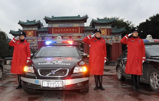 2011年1月3日早上,重慶人民廣場,女交巡警身穿王立軍設(shè)計(jì)的紅色雨衣舉行勤務(wù)出發(fā)儀式。(圖片來源:南都周刊)