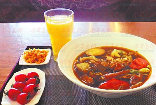 喝羊湯品紅酒:青島機(jī)場(chǎng)中圖咖啡廳,一碗湯面,也就康師傅碗面那么大的量,里面飄著幾粒牛肉粒,外帶三個(gè)小柿子,四片辣白菜,67元,真黑!這是我吃過(guò)的最貴的湯面!