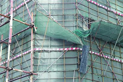 ????事故發(fā)生后,記者立刻趕到中啟膠建的銀座大廈工地,在知情者的指引下,記者在工地西北角找到了具體事發(fā)地點。這是一棟在建高樓,樓墻外圍著防護網(wǎng),3樓外墻處有一段防護網(wǎng)斷裂?!斑@些防護網(wǎng)就是被從塔吊上掉下來的木板砸壞的,也幸虧這些防護網(wǎng),不然樓下的工人可能會有生命危險?!痹诟浇苫畹氖忻窀嬖V記者,事發(fā)時工地塔吊正在運送木板,當這10多塊木板慢慢挪到變電站上方時,綁著木板的繩索突然松動,10多塊木板散落砸向地面。一名腰間纏著安全繩的工人將3樓防護網(wǎng)上的木板拖走并重新搭起了防護網(wǎng)。