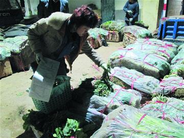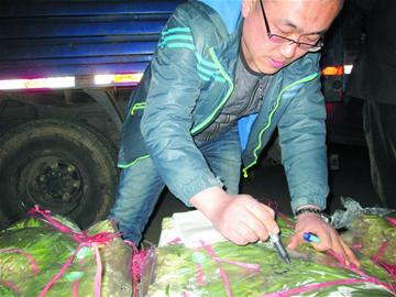 ????當(dāng)晚6點(diǎn)半,一名菜農(nóng)拉著一車韭菜來到了徐永波的收菜點(diǎn)。徐永波和工人沒急著往下搬菜,先借著駕駛室的燈光仔細(xì)檢查合格證,然后一筐一筐地看韭菜是否貼著編碼標(biāo)簽,一切手續(xù)檢查完畢之后,徐永波才開始稱重搬菜。而在收菜的過程中,徐永波總是拿著一只粗水筆,在每筐韭菜上寫著什么。“我這是標(biāo)上種植戶的名字,要是萬一出了問題,得能找到是誰種的菜。”徐永波說,他檢查一遍之后,到了批發(fā)市場(chǎng)還要再接受檢查。雖然手續(xù)繁瑣,但徐永波還是非常支持,“韭菜質(zhì)量有保障了,對(duì)我們菜商,對(duì)他們菜農(nóng)都有好處?!毙煊啦ㄕf,2010年高密韭菜曾被查出農(nóng)殘超標(biāo),結(jié)果韭菜價(jià)格在一周里從每斤2塊跌到了4毛,很多菜商和菜農(nóng)都虧了個(gè)精光,所以對(duì)于現(xiàn)在這套嚴(yán)格的檢測(cè)制度,大家都接受。