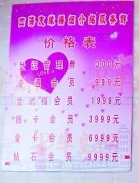 ????這300元僅僅是個(gè)管理費(fèi),交上這些錢就可以“見面”,但是沒有進(jìn)一步“談對(duì)象”的權(quán)利,“之后如果覺得合適你得補(bǔ)交會(huì)員費(fèi),會(huì)員費(fèi)不等,我們都掛出來了,只要交錢多,見的都是老板級(jí)的?!庇浾咴谂赃厬覓靸r(jià)格表上看到,普通會(huì)員價(jià)格999元,嘗試檔會(huì)員價(jià)格是1999元,銀卡會(huì)員3999元,金卡會(huì)員6999元,鉆石會(huì)員9999元?!斑@些價(jià)格在服務(wù)上到底有什么區(qū)別?見的層次是越來越高嗎?”趙女士沒有做正面回答,只說等董老師回來解釋,她只負(fù)責(zé)收費(fèi)其他的都不管。
