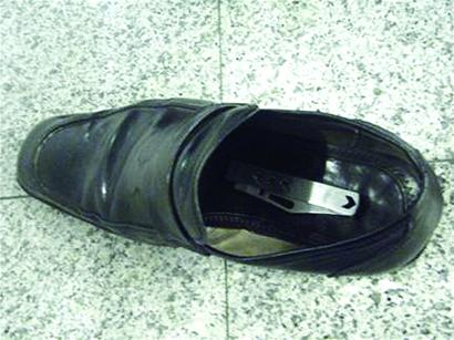 ????一名男子將一把折疊刀子藏在鞋內(nèi)試圖帶上飛機(jī)。昨天,青島機(jī)場安檢人員在國內(nèi)通道執(zhí)行安檢任務(wù)時發(fā)現(xiàn)了這一藏匿情況,當(dāng)即取消該旅客乘機(jī)資格。