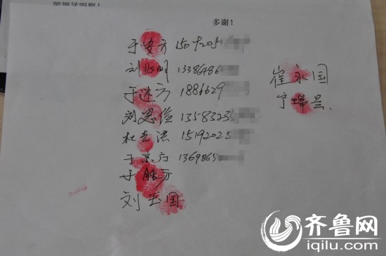 山東青島即墨市龍山街道辦事處東南貢村十位村民向記者所提供的實名舉報簽名