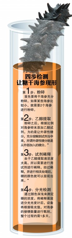 ????專家指出,有些檢測當中只發(fā)現(xiàn)少量糖摻入的干海參同樣存在問題,“這些海參來自熱帶海域,由于生長期非常短,營養(yǎng)價值很小”。