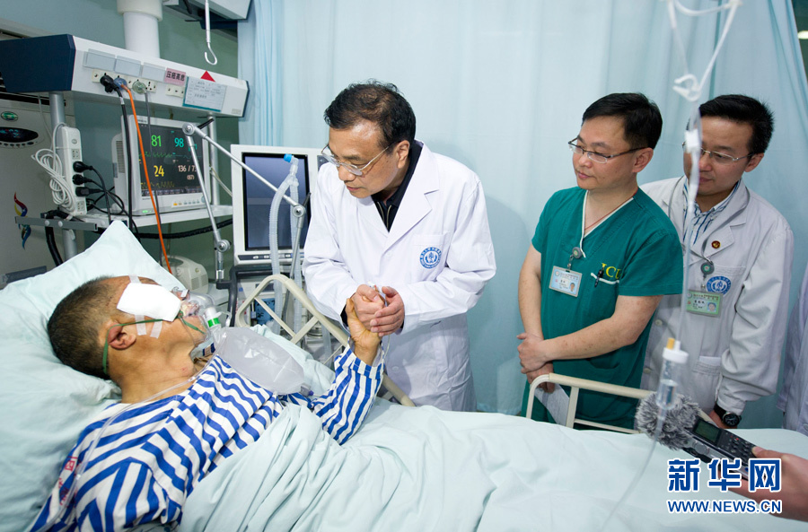 4月21日,中共中央政治局常委、國(guó)務(wù)院總理李克強(qiáng)來(lái)到成都華西醫(yī)院,看望在這里接受治療的蘆山“4·20”地震危重傷員。新華社記者黃敬文攝