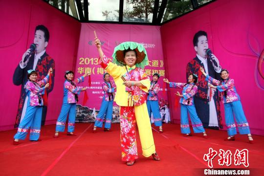圖為一名七十多歲的在選拔賽上演唱客家山歌?!〔绦佬馈z