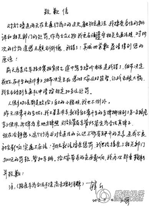 4日下午,韓紅手寫一封道歉信?!皩τ诮舆B兩天在交通行為上的過失,觸犯交通法,我接受各位的批評和相關(guān)部門的處罰。作為公眾人物我更應(yīng)該遵守相關(guān)交通法規(guī)。對此次的行為深感無顏與慚愧,我錯了!真誠地道歉,懇請得到您的原諒!”